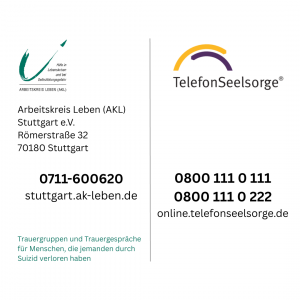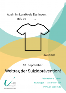 Im Zuge des Welttages der Suizidprävention 2025 werden in der Landeshauptstadt Stuttgart sowie in den Landkreisen Tübingen, Böblingen, Heilbronn und Esslingen an öffentlichen Orten T-Shirts ausgelegt. Die Anzahl der T-Shirts verdeutlicht die Zahl der Suizide des vorangegangenen Jahres in den jeweiligen Stadt- und Landkreisen. „Die Aktion soll anschaulich darstellen, wie groß die Betroffenheit auch lokal ist. Bei jedem Suizid sind nicht nur direkte Angehörige und Freunde betroffen. Auch Kolleg:innen, Lehrer:innen und andere im Umfeld sind Menschen, die dadurch mit dem Thema in Berührung kommen und oft nicht wissen, wie sie damit umgehen sollen.“, weiß Kathrin Paul-Prössler, Geschäftsführerin des AKL Nürtingen-Kirchheim. „Mit der Aktion wollen wir weiter zur Enttabuisierung des Themas Suizid in unserer Gesellschaft beitragen und konkrete Hilfsangebote aufzeigen.“ Mitarbeiter:innen und Ehrenamtliche der Arbeitskreise Leben in Stuttgart, Tübingen / Reutlingen, Heilbronn, Böblingen und Nürtingen-Kirchheim stehen vor Ort bei den jeweiligen Aktionen für Austausch und Informationen für Betroffene, Angehörige, Hinterbliebene wie auch Interessierte zur Verfügung.