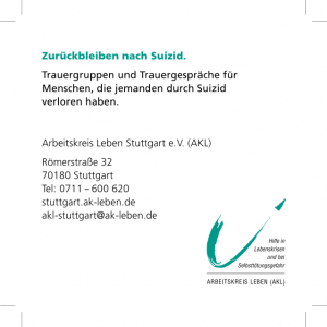 • Stuttgart (AKL Stuttgart): von 10 bis 15 Uhr auf dem Schlossplatz (hinter dem Brezelstand) in Stuttgart in Kooperation mit der evangelischen und katholischen Telefonseelsorge